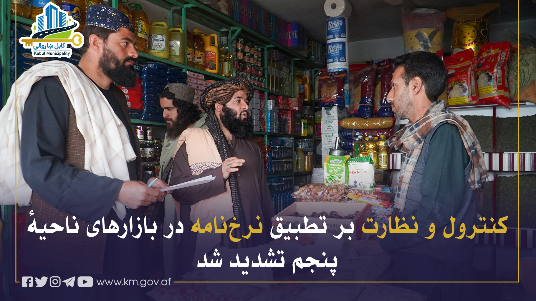 برای تأمین ثبات قیمتها و جلوگیری از تخطی در فروش مواد اولیه، کنترول و نظارت بر تطبیق نرخنامهٔ شاروالی کابل در بازارهای ناحیهٔ پنجم بهگونهٔ همهجانبه انجام شد.