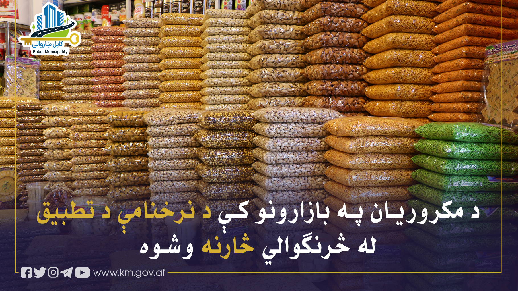 د کابل ښاروالۍ د مارکیټونو د تنظیم ریاست له احتکار څخه د مخنیوي او د لومړنیو توکو د بیو د کنټرول په موخه، د نهمې ناحیې اړوند د مکروریان په بازارونو کې د نرخنامې د تطبیق له څرنګوالي څارنه وکړه..