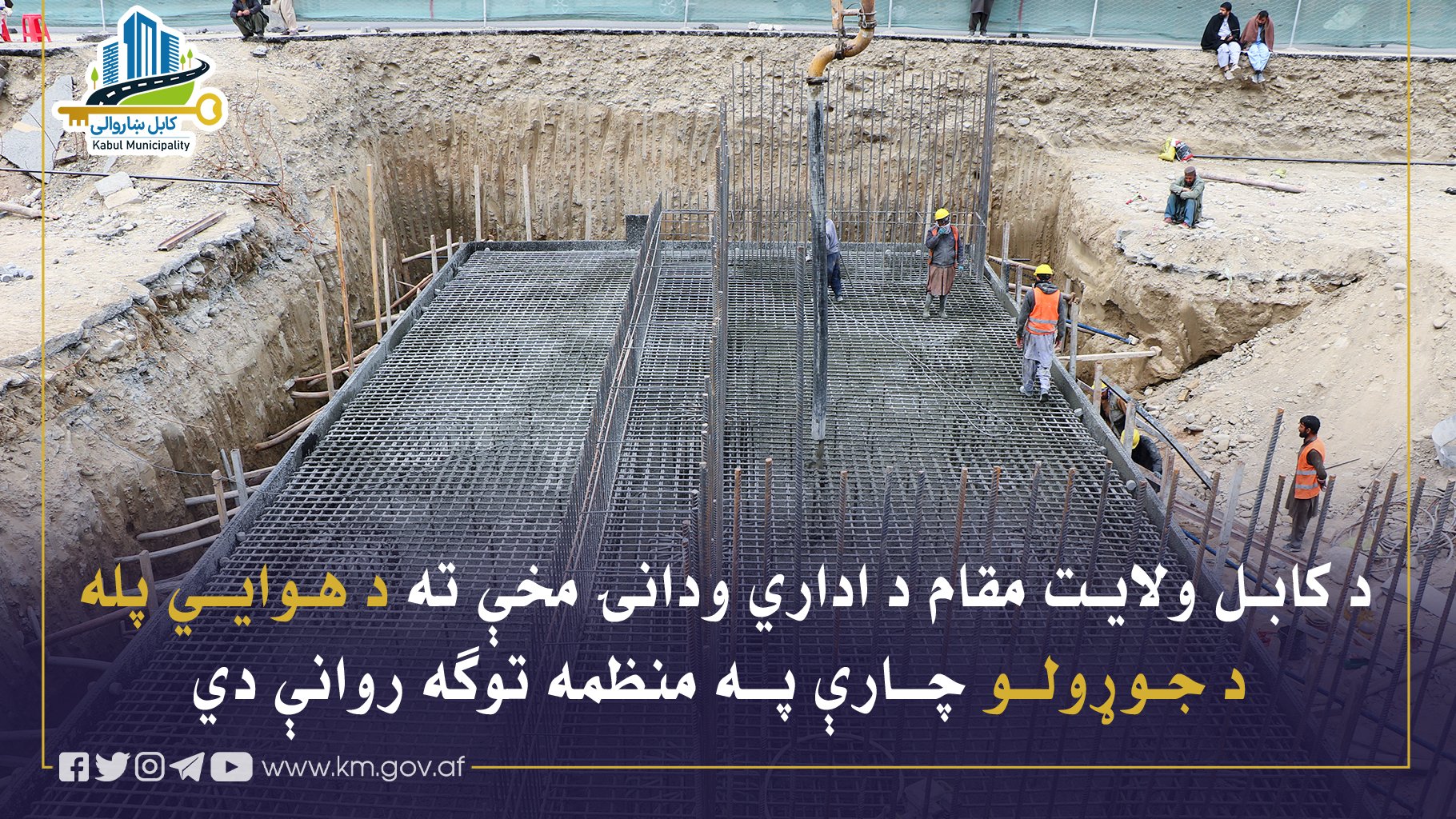 د کابل ښاروالۍ د کار، ساتنې او مراقبت ریاست له خوا د کابل ولایت مقام د اداري ودانۍ مخې ته د صدارت څلورلارې او جوی شیر سړک ترمنځ د موټرو د تګ راتګ هوايي پله د جوړولو چارې روانې دي.
