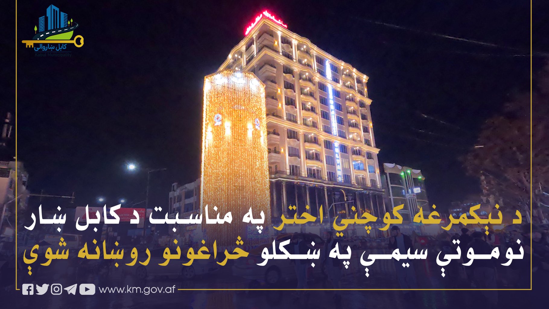 د کابل ښاروالۍ د کلتوري چارو ریاست د هڅو او زیار په پایله کې د خصوصي سکتور په همکارۍ، د نېکمرغه کوچني اختر په مناسبت د کابل ښار بڼه ښکلې او په څراغونو روښانه شوې ده.