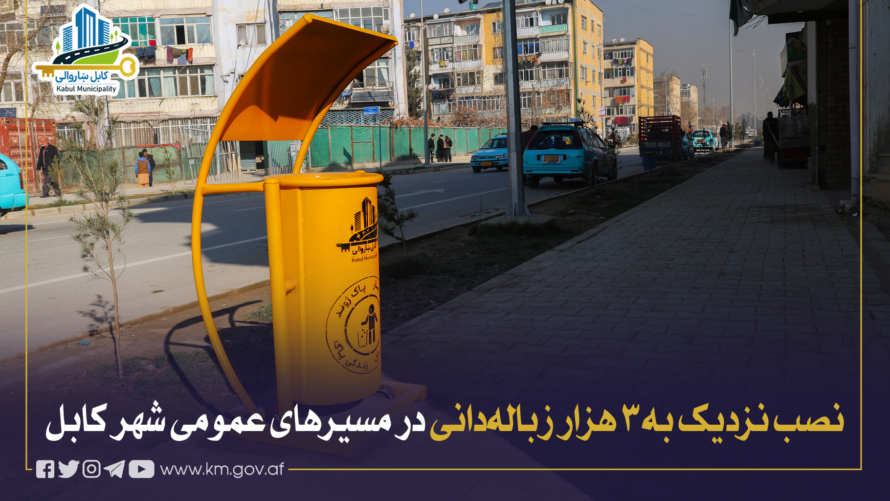 ریاست تنظیف شاروالی کابل به منظور مدیریت بهتر زبالهها و حفظ پاکیزگی محیط شهری، از آغاز برنامه نصب زبالهدانیهای مخصوص پیادهروها، موفق شده است نزدیک به ۳ هزار پایه زبالهدانی شهری را در مسیرهای عمومی و شبکههای پیادهروی در ۲۲ ناحیه شهر نصب نماید.