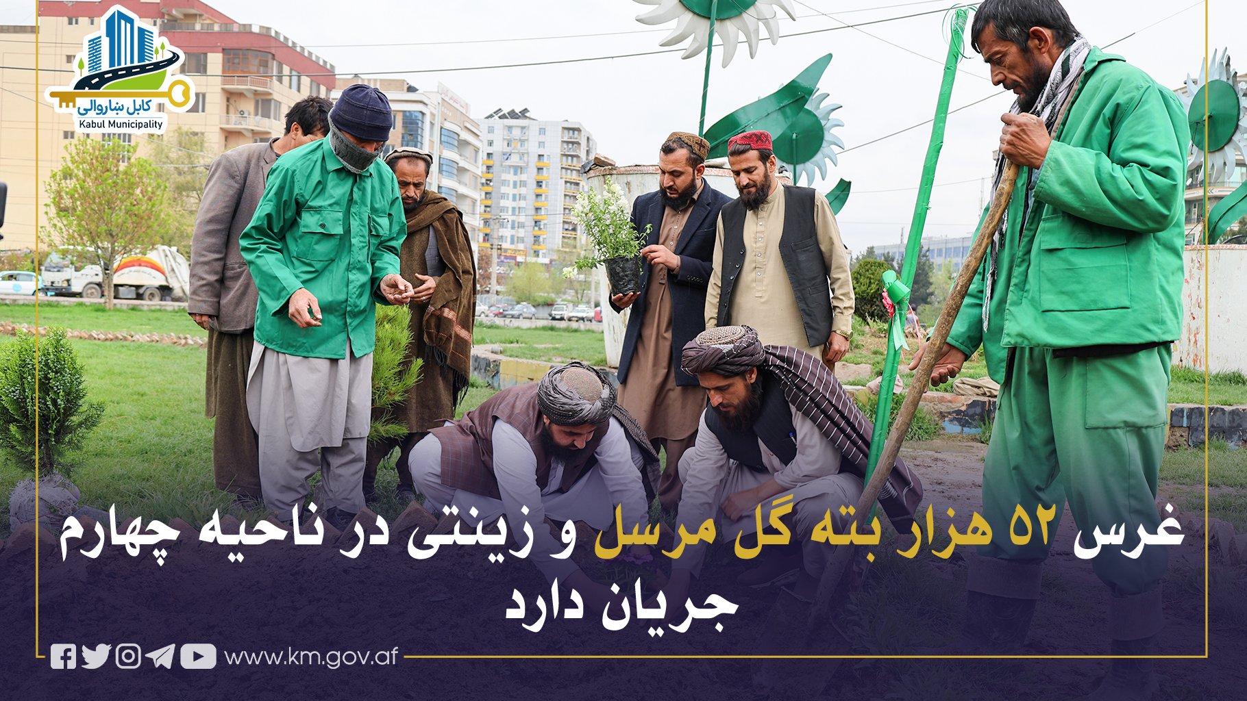 به منظور توسعه سرسبزی و زیباسازی سیمای شهری، برنامهٔ غرس ۵۲ هزار بته گل مرسل و زینتی در گلدانهای سرکها، ساحات سبز و پارکهای ناحیه چهارم از سوی ریاست سرسبزی شاروالی کابل جریان دارد.
